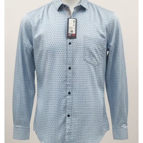Light blue textured cotton shirt featuring an all-over small geometric print and a classic button-down collar design.