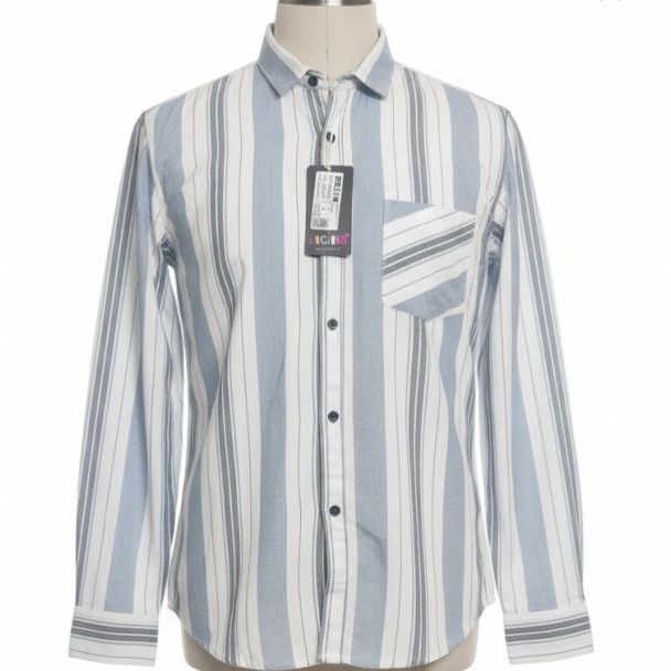 This woven cotton shirt displays a textured fabric with distinct vertical stripes alternating between light blue, white, and thin charcoal lines. It features a standard collar, full-length sleeves with buttoned cuffs, and a single chest pocket with diagonal stripes for contrast. The fit appears tailored. Available at Gangavathiexports with exceptional quality and unbeatable pricing.
