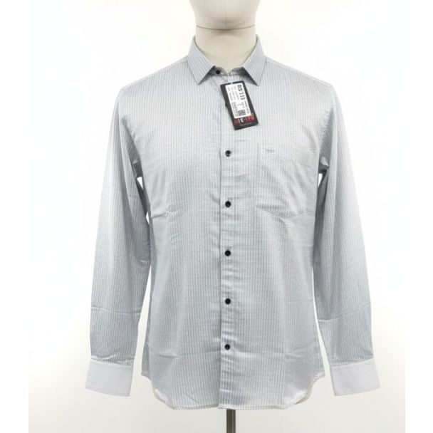 Light gray cotton shirt with a subtle vertical stripe pattern, full sleeves, button-down closure, and a classic collar.