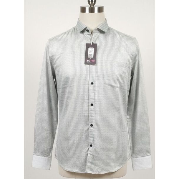 This light gray cotton shirt features vertical stripes, full sleeves, a button-down closure, and classic collar style.