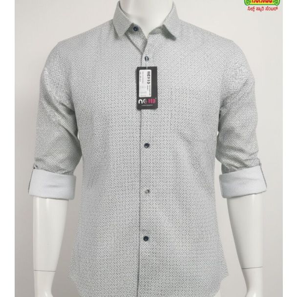 This cotton blend men's shirt features a crisp light grey base adorned with a subtle, dense geometric print. It has a structured collar, full button placket with contrasting dark navy buttons, and full sleeves. The tailored cut ensures a sharp silhouette. Available at Gangavathiexports with exceptional quality and unbeatable pricing.