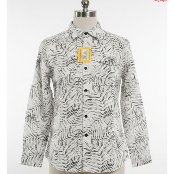 This breathable cotton blend shirt features a light grey base adorned with a dense charcoal grey tropical leaf print. It boasts a classic spread collar, full button-down placket with dark buttons, and long cuffed sleeves. A regular fit provides comfort. Available at Gangavathiexports with exceptional quality and unbeatable pricing.