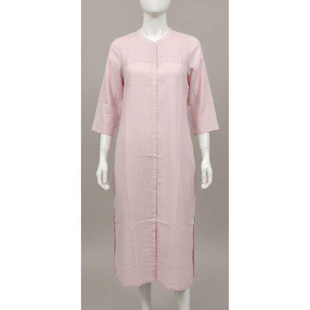 Why Buy This Product? This light pink kurti is an excellent choice for those seeking a blend of comfort, style, and versatility. The soft cotton fabric ensures all-day comfort, while the modern design details like the mandarin collar and 3/4 sleeves add a touch of sophistication. Its budget-friendly price makes it accessible to everyone, and its versatile nature allows you to pair it with various bottoms and accessories, creating different looks effortlessly.