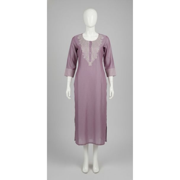 Lilac Embroidered 3/4 Sleeve Cotton Kurti for Women