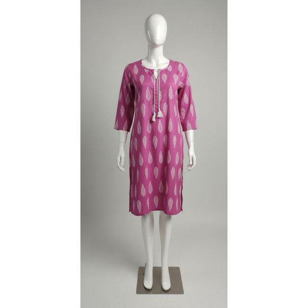 Magenta Printed Cotton Kurti Knee Length 3/4 Sleeve