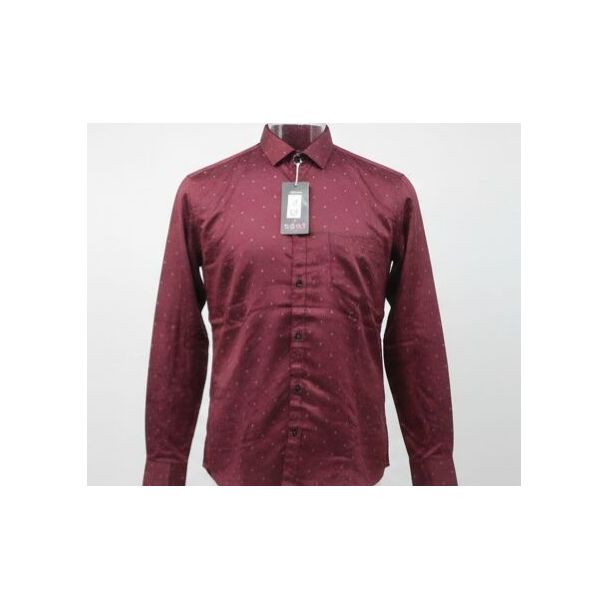 This shirt appears to be made from a smooth cotton blend fabric. It is a deep maroon color with a fine dot pattern. The shirt has long sleeves with buttoned cuffs, a classic collar and a regular fit. The front features a chest pocket. Available at Gangavathiexports with exceptional quality and unbeatable pricing.