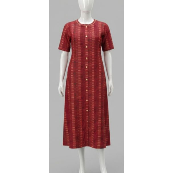 Why Buy This Product? This maroon printed kurti offers a perfect blend of style, comfort, and versatility. The unique pattern and rich color make it a standout piece, while the A-line cut ensures a flattering fit for various body types. This kurti not only enhances your wardrobe but also boosts your confidence, making you feel your best with its elegant and comfortable design. It's the perfect statement piece without breaking the bank.