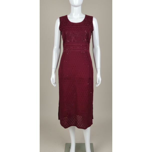 Why Buy This Product? This maroon sleeveless embroidered A-line kurti perfectly combines style, comfort, and versatility. The unique design elements, including the rich color and A-line fit, create a flattering and fashionable look. It's the perfect choice for making a statement at any party or special occasion, while also offering the comfort you need to enjoy your event to the fullest.