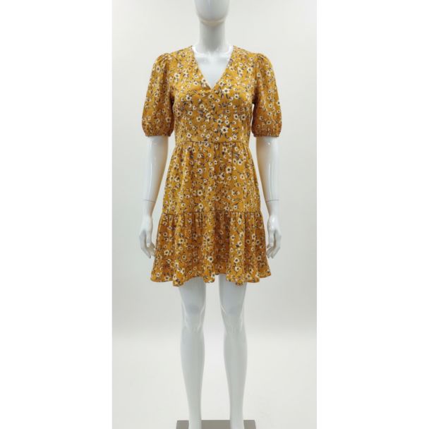 Mustard Yellow Small Floral Western Style Mini Dress with Puffed Sleeves