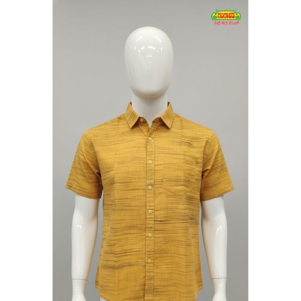 This men's casual shirt appears to be made from a textured cotton or blend fabric in a rich mustard or deep ochre color. It features a distinct pattern of fine, irregular horizontal dark brown or black slub lines creating a subtle linear texture. It has short sleeves, a standard pointed collar, and a button-down front closure, complete with a single chest pocket. Available at Gangavathiexports with exceptional quality and unbeatable pricing.