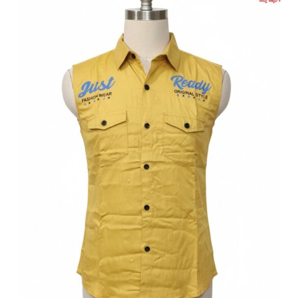 This mustard yellow garment appears to be a durable cotton fabric shirt with a slight texture. It features a sharp collar, is entirely sleeveless, and fastens with black buttons down the center. Dual flap chest pockets, secured with black buttons, adorn the front, accented by blue graphic text prints. Available at Gangavathiexports with exceptional quality and unbeatable pricing.
