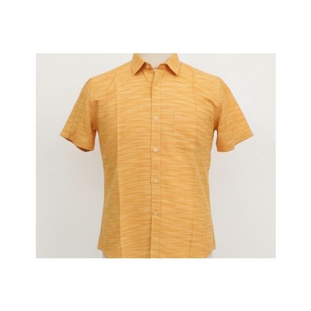 The shirt is crafted from a fabric that appears to be cotton with a slightly textured weave. It is a mustard yellow color with lighter yellow horizontal stripes. The short sleeves are simple and finished. It has a classic collared neckline and a button-up front, with a single pocket. Available at Gangavathiexports with exceptional quality and unbeatable pricing.