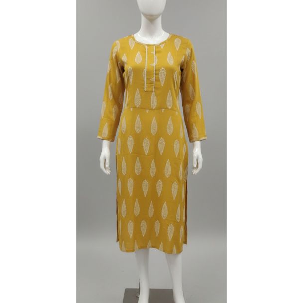 Embrace effortless style and comfort with this beautiful Mustard Yellow kurti, designed for everyday wear. This kurti offers a flattering A-line silhouette, making it suitable for a variety of body types. The eye-catching leaf print adds a touch of charm, making it a versatile addition to your wardrobe. This budget-friendly kurti is perfect for those seeking both fashion and affordability.