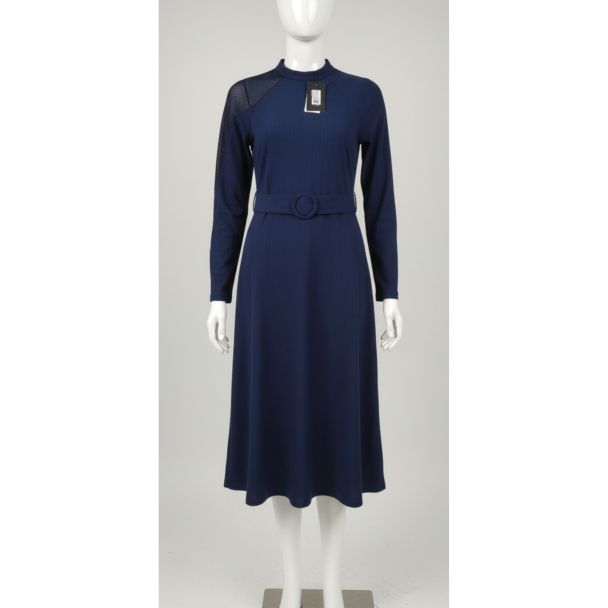 Navy Blue Belted Midi Dress Long Sleeve A-Line