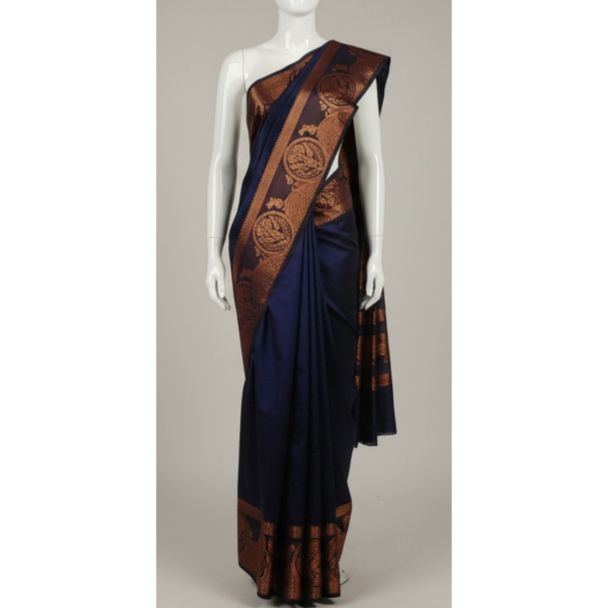 Why Buy This Product? This exquisite navy blue cotton mix saree is a perfect blend of traditional craftsmanship and contemporary style. The rich color, coupled with the dazzling copper zari border, makes it a versatile piece for any festive wardrobe. Its comfortable fabric ensures you look and feel great throughout any event.
