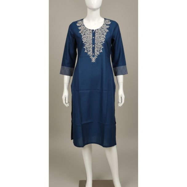 Why Buy This Product? This navy blue kurti is a perfect blend of style and comfort. Its breathable cotton fabric keeps you cool and comfortable throughout the day, while the elegant embroidery adds a touch of sophistication. The A-line cut provides a flattering fit for all body shapes, making it a versatile choice. This budget-friendly kurti is an excellent choice for a timeless look.