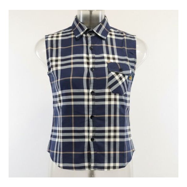 This sleeveless shirt is crafted from a comfortable cotton-like fabric and showcases a navy blue plaid pattern, accented with white, beige, and black lines. It features a classic collar and a button-down front closure. The shirt has a single chest pocket. Available at Gangavathiexports with exceptional quality and unbeatable pricing.