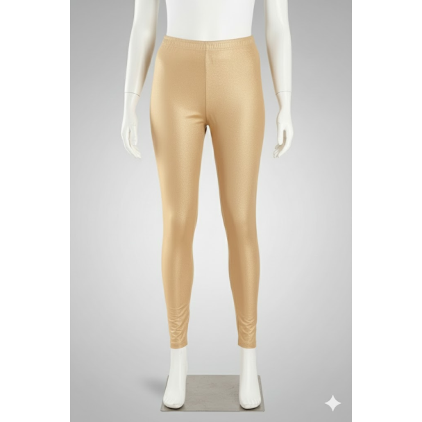 These sleek leggings are crafted from a smooth, stretchy fabric with a subtle all-over nude shimmer texture. They feature an elasticated waistband for a secure, comfortable fit and a flattering ankle-length, skin-tight silhouette. The versatile light golden beige hue offers a chic, polished look. Available at Gangavathiexports with exceptional quality and unbeatable pricing.