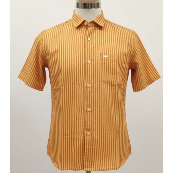 This shirt showcases a light orange cotton fabric with vertical brown stripes. It features short sleeves and a classic collar neckline. The shirt has a regular fit, with a pocket at the chest. Available at Gangavathiexports with exceptional quality and unbeatable pricing.