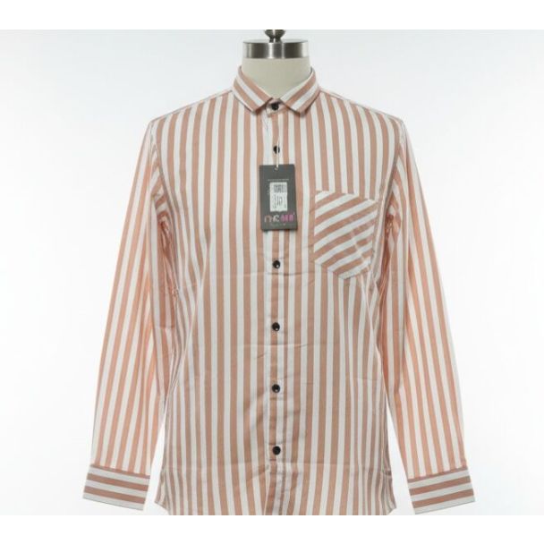 This shirt showcases a classic cotton fabric with vertical stripes in a peach and white color palette. It features long sleeves and a collared neckline, with a chest pocket. The shirt offers a standard fit, perfect for versatile wear. Available at Gangavathiexports with exceptional quality and unbeatable pricing.
