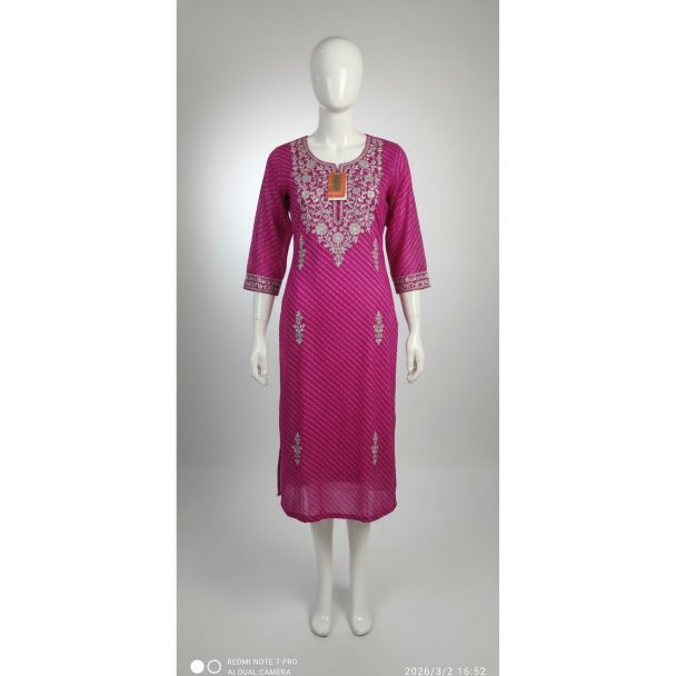 This budget-friendly Kurti offers exceptional value by combining rich traditional design elements like Leheriya and heavy yoke embroidery with the comfort of cotton. The bright Rani Pink hue ensures you stand out, while the quality stitching means it remains a durable staple in your collection. It instantly upgrades your ethnic style quotient effortlessly.