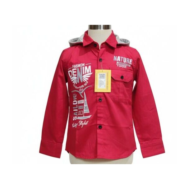 This children's shirt showcases a vibrant red hue, likely cotton fabric, offering a casual look. It features a grey hooded detail. The long sleeves offer coverage. A pocket is featured on the chest. Various graphic prints are applied adding a touch of style. Available at Gangavathiexports with exceptional quality and unbeatable pricing.