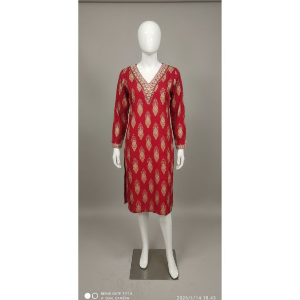 Red Printed Cotton Kurti V-Neck Full Sleeve