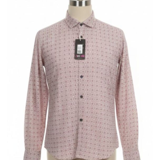 A reddish-pink shirt, featuring a geometric pattern, long sleeves, and a classic button-down style. It's a versatile look.