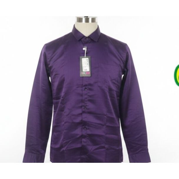 A lustrous, solid-colored shirt in a rich purple, featuring long sleeves and a classic collar.