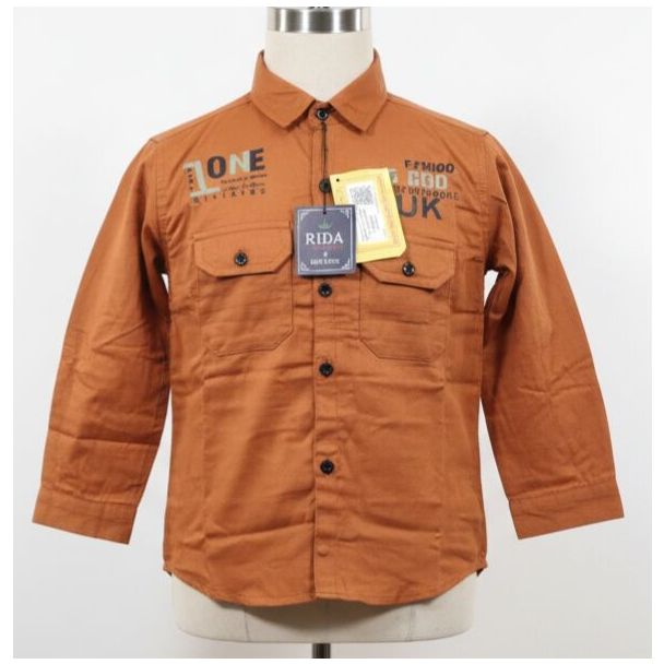This shirt features a textured cotton fabric in a rustic brown hue. The shirt has a collared neckline, long sleeves with buttoned cuffs, and a button-down front closure. The design includes two chest pockets with button flaps and graphic prints on the shoulders. Available at Gangavathiexports with exceptional quality and unbeatable pricing.