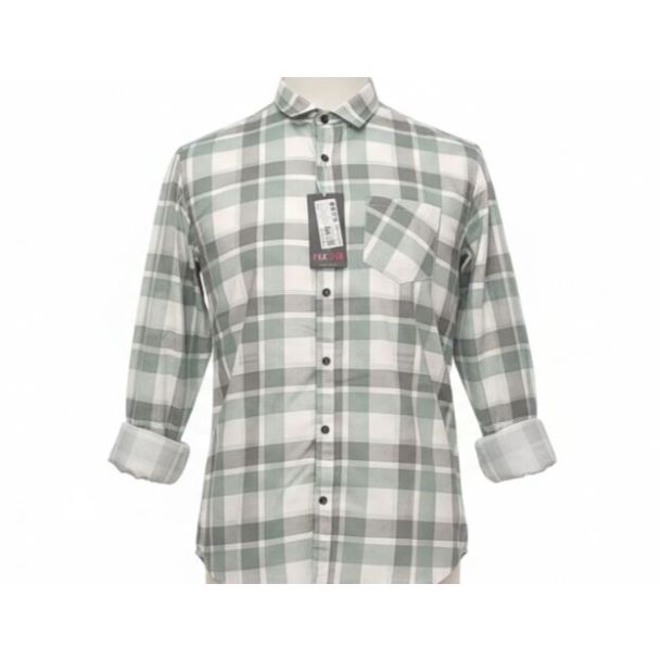 This casual men's shirt displays a soft cotton texture in a prominent plaid pattern mixing sage green, deep gray, and white squares. It features a standard collar, black buttons, long sleeves cuffed up, and a functional chest pocket. Available at Gangavathiexports with exceptional quality and unbeatable pricing.