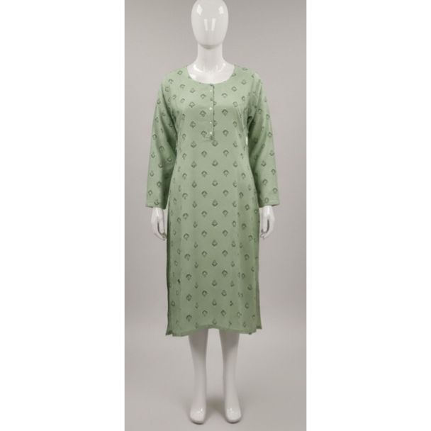 Why Buy This Product? This sage green kurti combines comfort and style at an affordable price point. Its lightweight cotton fabric makes it ideal for warm weather, and the subtle print adds a touch of sophistication. The full sleeves and knee-length design offer both coverage and versatility, allowing you to create a variety of looks. The easy-care fabric makes it a practical choice for everyday wear, simplifying your routine while keeping you stylish.