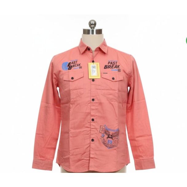 This salmon pink cotton shirt, with a fine texture, features bold graphic prints in light blue and black on the chest and lower front. It includes a classic pointed collar, full sleeves with buttoned cuffs, and two chest pockets with button flaps. Available at Gangavathiexports with exceptional quality and unbeatable pricing.