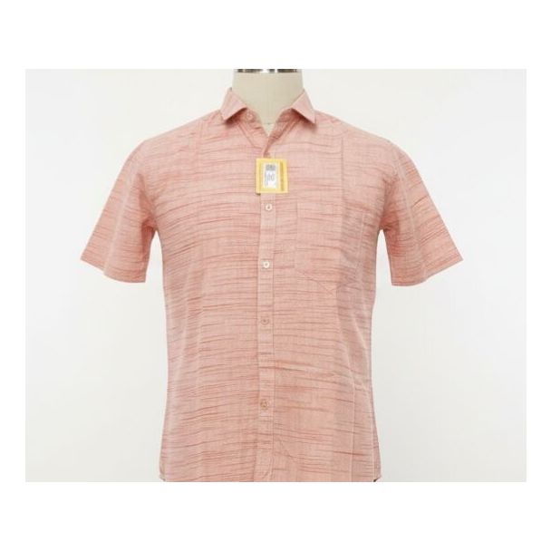 This shirt is made from a textured cotton fabric in a soft salmon pink hue. It features a subtle horizontal pattern throughout. The short sleeves and classic collar offer a relaxed yet refined look. The fit appears to be a standard cut with a chest pocket. Available at Gangavathiexports with exceptional quality and unbeatable pricing.