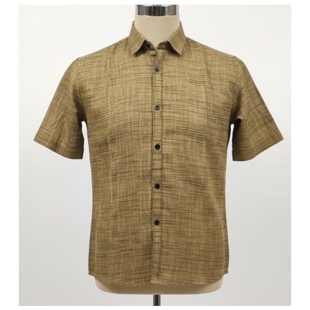 This shirt displays a textured khaki fabric, exhibiting a faint horizontal and vertical striped pattern. It features short sleeves and a classic collar. The design includes a button-up front closure. The tailoring appears to be a regular fit, suitable for various body types. Available at Gangavathiexports with exceptional quality and unbeatable pricing.