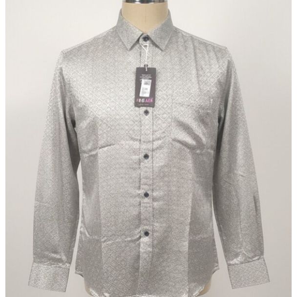 A silver button-down shirt with a geometric pattern, featuring a classic collar and long sleeves.