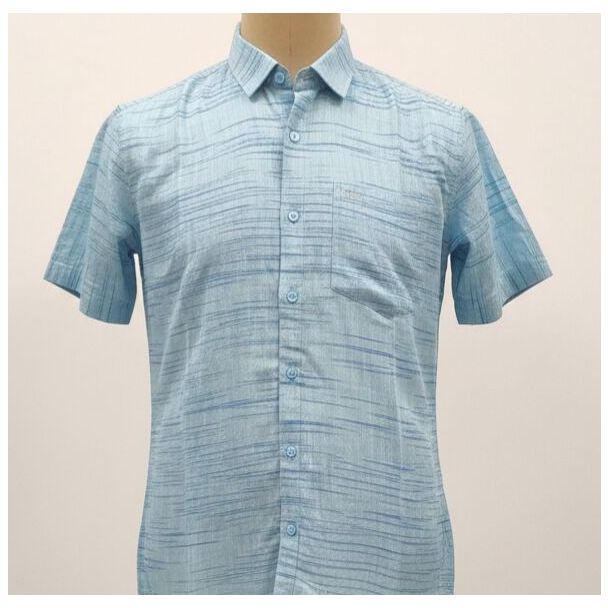 This light sky blue shirt is crafted from textured cotton fabric, featuring an intricate abstract pattern of mid-blue horizontal lines, giving it a unique slub effect. It has short sleeves, a standard point collar, a full button placket, and a functional chest patch pocket. The cut provides a regular, comfortable fit suitable for casual or smart wear. Available at Gangavathiexports with exceptional quality and unbeatable pricing.