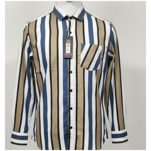 This shirt displays a vertical stripe pattern. It appears to be made of cotton. The color palette includes blue, beige, white, and black stripes. It features a collared neckline, long sleeves with buttoned cuffs, a chest pocket, and a button-down closure. Available at Gangavathiexports with exceptional quality and unbeatable pricing.