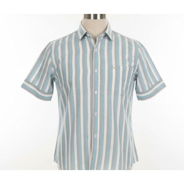 This shirt appears to be made from a cotton blend and features vertical stripes in light blue, gray, and white. It has short sleeves, finished with a subtle hem. The classic collar and button-down front provide a smart casual aesthetic. The shirt is finished with a pocket on the chest. Available at Gangavathiexports with exceptional quality and unbeatable pricing