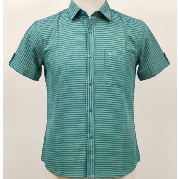 This cotton shirt features horizontal stripes in teal and light grey. It has short sleeves that can be rolled up and fastened with a buttoned tab. The shirt also has a collared neckline, button-down closure and a small pocket on the left chest. The fit is a tailored casual fit. Available at Gangavathiexports with exceptional quality and unbeatable pricing.