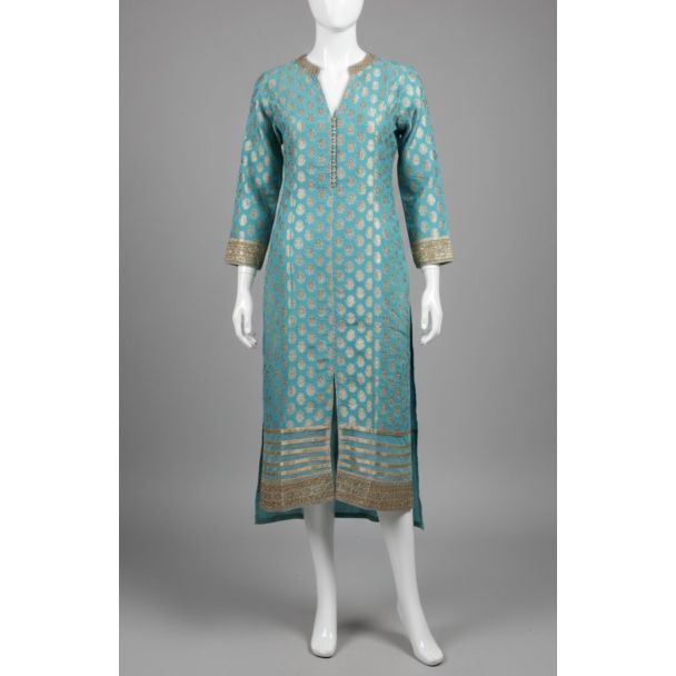 Teal Blue Brocade Kurti 3/4 Sleeve V-Neck Straight
