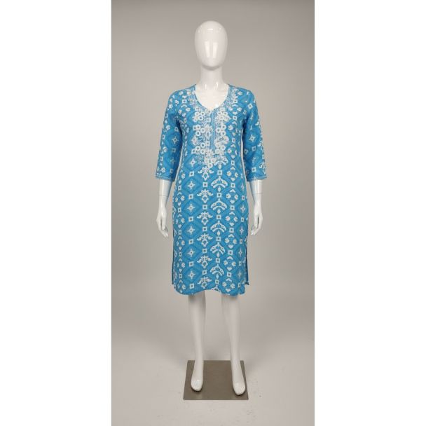 Teal Blue Geometric Print Cotton Kurti 3/4 Sleeve
