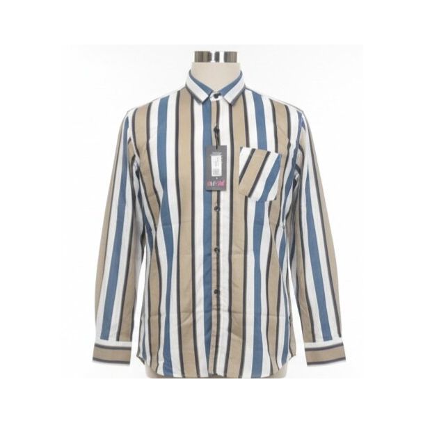 This cotton shirt features vertical stripes in cream, blue, and brown. It offers a classic button-up design and long sleeves.