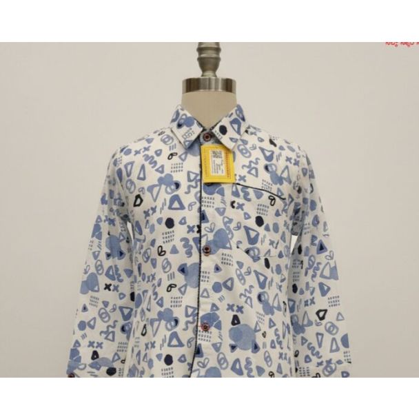 The shirt appears to be made of cotton with a crisp texture. The base color is white, adorned with various abstract shapes in shades of blue. It features full-length sleeves and a collared neckline. The overall fit is regular, offering a versatile style. Available at Gangavathiexports with exceptional quality and unbeatable pricing.