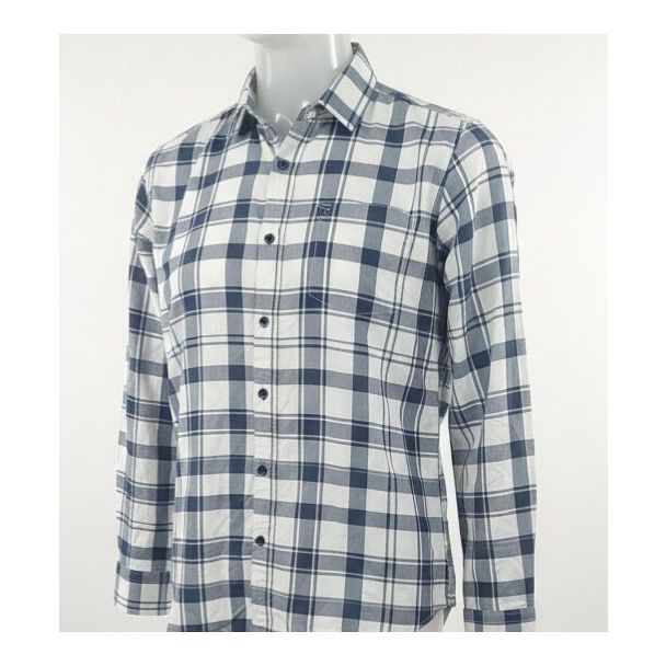 White and Navy Blue Plaid Cotton Shirt, Long Sleeve, Button-Down