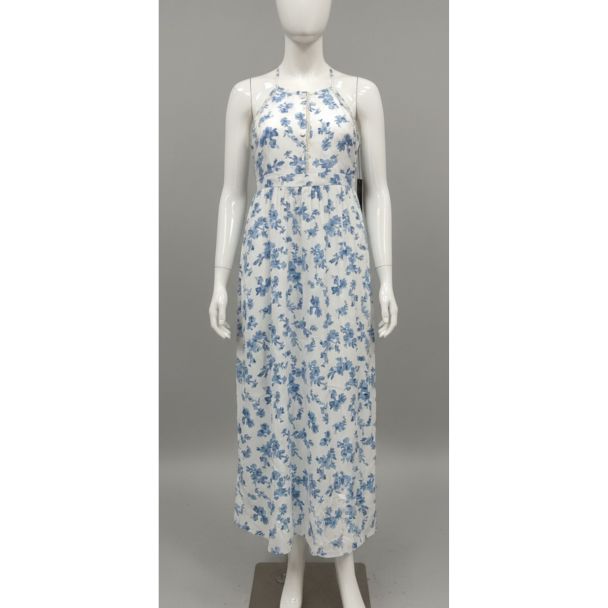 White & Blue Floral Cotton Maxi Dress Halter Neck