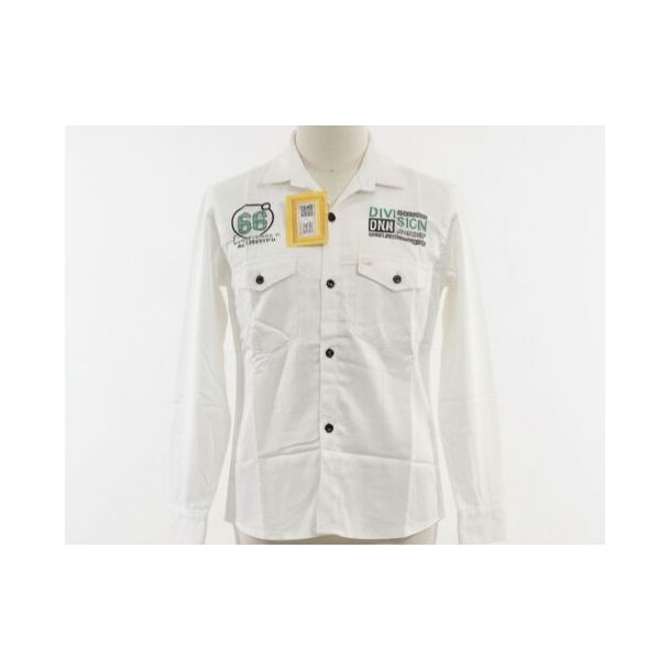 A crisp white cotton shirt featuring a classic collar, long sleeves, and graphic patches, exuding a casual vibe.