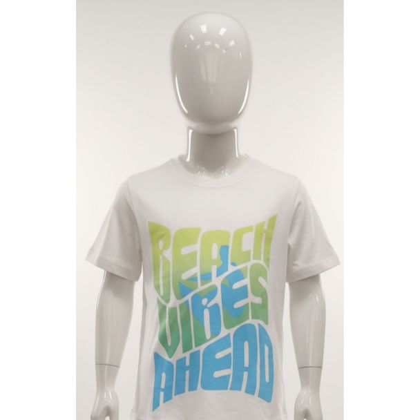 White kids' t-shirt with a 'Beach Vibes Ahead' graphic print, short sleeves, and a comfortable cotton fabric.