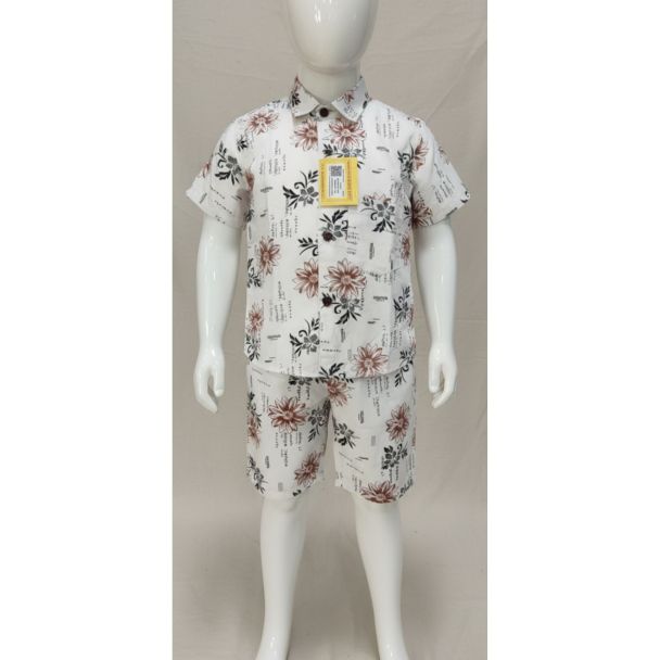 White Floral Print Cotton Shirt & Shorts Set - Boys