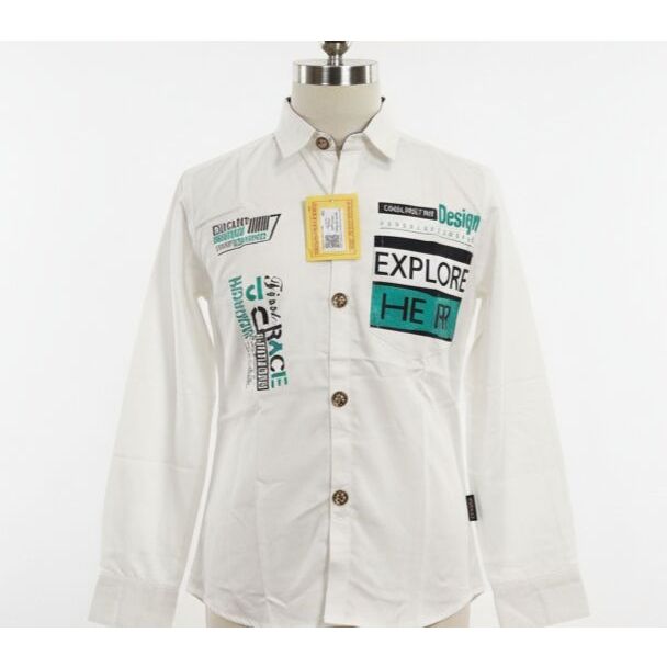 This crisp white cotton shirt has a structured collar and full-length sleeves with standard cuffs. It showcases dense graphic prints in black, teal, and dark green using words like 'EXPLORE' and 'RACE'. The fit appears straight, featuring dark, textured buttons down the placket. Available at Gangavathiexports with exceptional quality and unbeatable pricing.